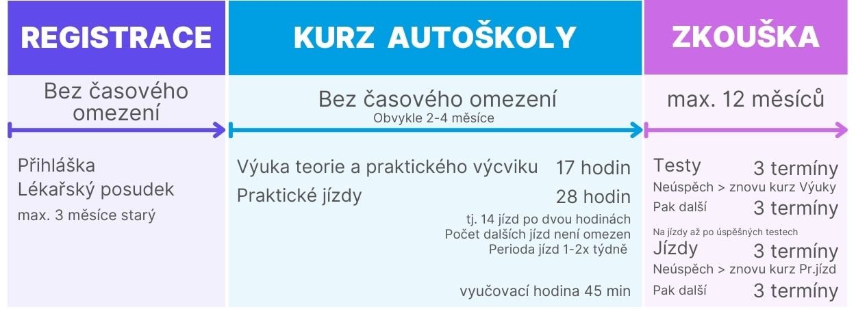 Jakmile po absolvování teorie (17 hodin) a jízd (28 hodin / 14 jízd) zvládáte řízení s jistotou, jezdíte plynule a bezpečně, jste připraveni na zkoušku.