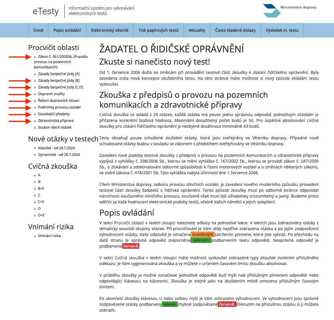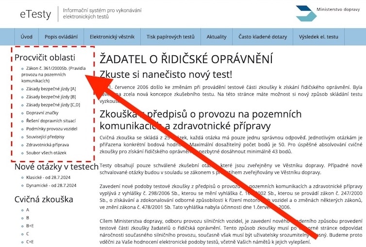 Na stránce Ministerstva dopravy v části: „Procvičit oblasti“ (vlevo nahoře).